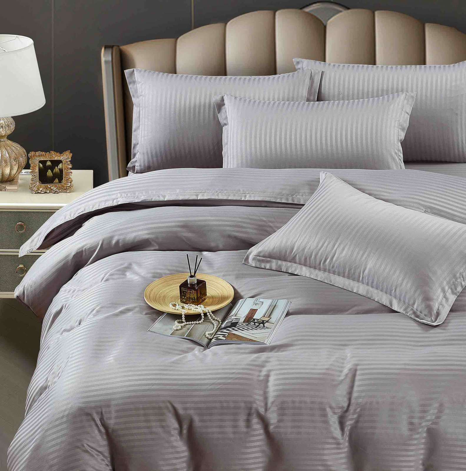 Lenjerie de pat dublu Damasc Cearceaf cu Elastic 6 piese Gri