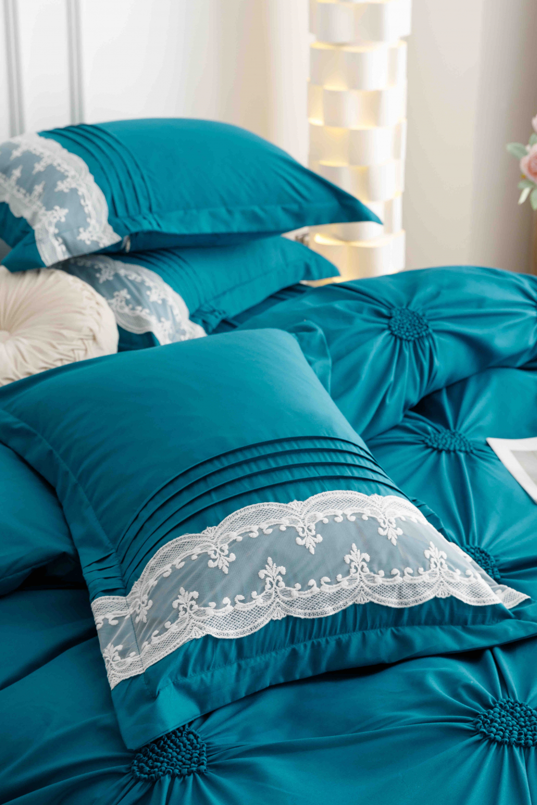 Cearceaful pentru pilotă se închide cu fermoar iar detaliile cu inimioare brodate adauga un aspect de lux si eleganta. Fețele de pernă au de jur imprejur volanse, cele de 55x75cm sunt petrecute parte peste parte suficient astfel încât perna să nu iasă din fața de pernă, iar cele de 70x70cm se inchid cu fermoar.